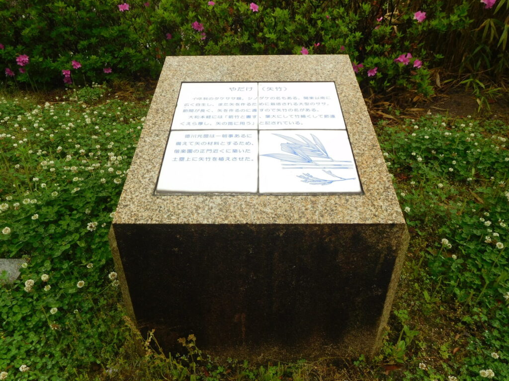 イネ科のタケササ類。シノダケの名もある。関東以南に広く自生し、また矢を作るために栽培される大型のササ。節間が長く、矢を作るのに適すので矢竹の名がある。大和本経には「箭竹と書す、葉大にして竹細くして節遠くえら厚し、矢の箆に用う」と記されている。徳川光圀は一朝事あるに備えて矢の材料とするため、偕楽園の正門近くに築いた土塁上に矢竹を植えさせた。