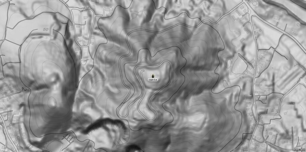山頂付近の3つの曲輪を囲む横堀があり、幅10m、高さ8mもの空堀が二重になっている場所も存在しまが、現地は山林となっており、私有地のため立ち入りが禁止されているため、注意が必要です。