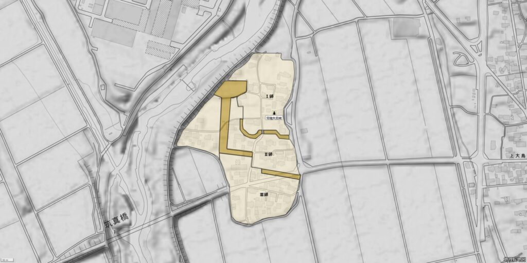 南北に連なる3つの郭で構成されていたと推定され、多くの遺構は失われましたが、南西に位置する墓地には土塁や堀跡と見られる地形がわずかに残されています。