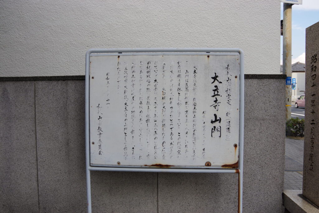 大立寺は文禄年間(安土桃山時代)の創建と伝えられる。山門は医薬門型式で、高さ5.8メートルある。材質は欅を主体とし、栂を混えている。この門は室町時代末期の紀州在地勢力のひとつである「太田党」の居館であった「太田城」の大門を移築したものと伝えられている。