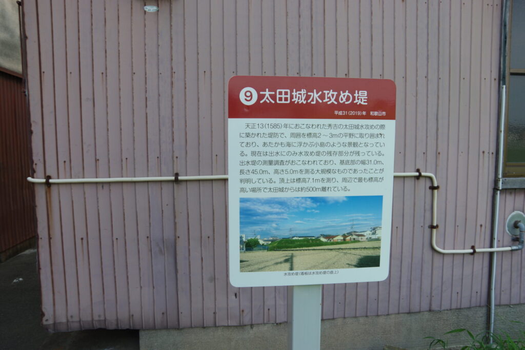 天正13(1585)年、豊臣秀吉の紀州攻めに際し、太田党は太田左近宗正を大将として、約5000人が太田城に立てこもり、十万余人の秀吉軍に対して強く抵抗したため、秀吉軍は城を取り囲む総延長5-6キロメートルにも及ぶ堤を築き、水攻めをおこなった。