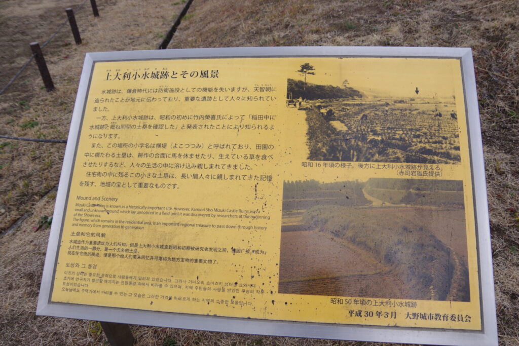 水城跡は、鎌倉時代には防衛施設としての機能を失いますが、天智朝に造られたことが地元に伝わっており、重要な遺跡として人々に知られていました。一方、上大利小水城跡は、昭和の初めに竹内榮喜氏によって「稲田中に水城跡と概ね同型の土塁を確認した」と発表されたことにより知られるようになります。