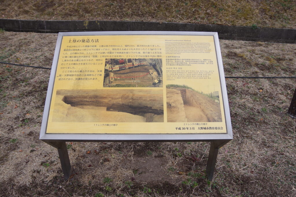 平成29年に行った調査の結果、土塁は長さ約90m以上、幅23m、高さ約5mありました。基底部は現在より約2m下に埋まっており、現在見える姿よりも大きかったことが分かりました。土の積み方は、1トレンチでは硬い地盤まで地表面を掘り下げた後、