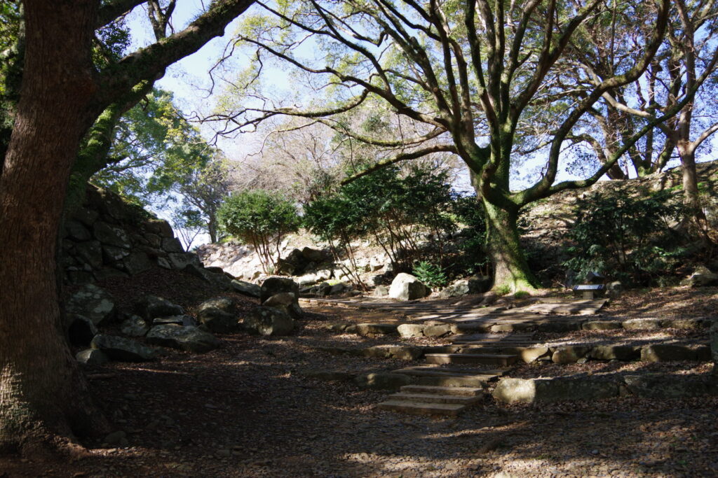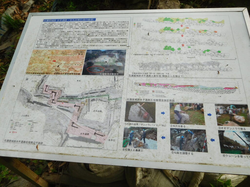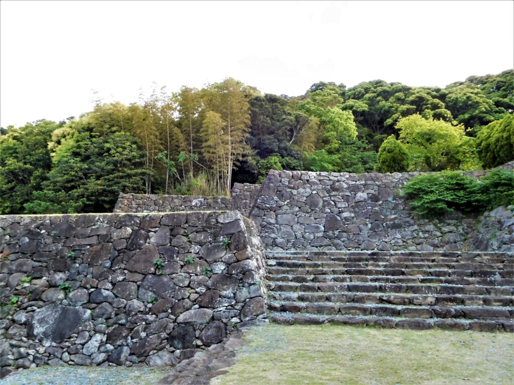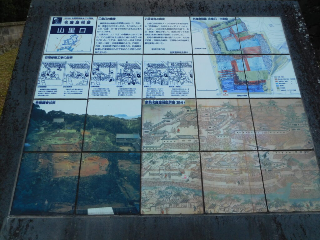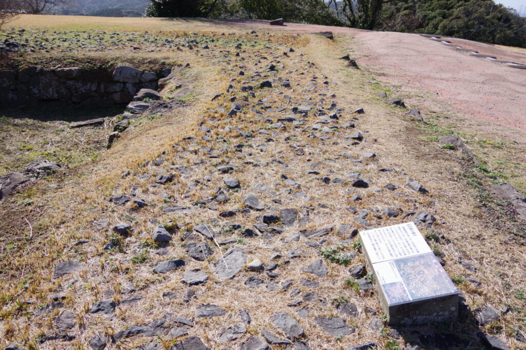 名護屋城内には、このような改造の跡が各所で発見されていますが、その理由としては「割普請」によって城造りを各大名に分担して行わせたことや、出兵に合わせ、築城を急いだことなどが推定されます。ここでは、名護屋城の特色である、大規模な改造の様子を実感できるように、旧石段を掘り下げて整備し、改造前と改造後の地面の高さの違いを表現しています。※現地説明板より