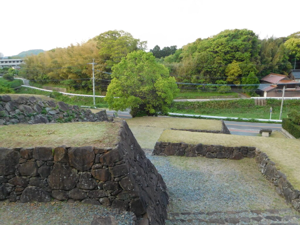 城の正面入口といわれており、ここから南に向かって唐津に通じる「太閤道」と呼ぶ道がのびています。平成4年度の発掘調査で、櫓台下の東側広場から掘立柱跡が見つかりました。また前面の石垣からは、石垣改築の跡を見つけることができました。