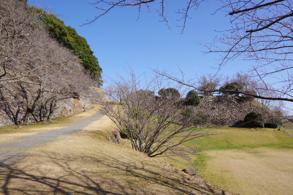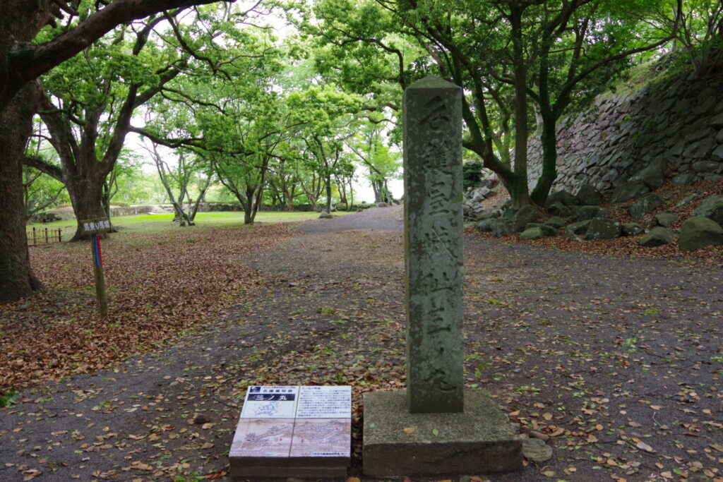 本丸の南側にあたり、本丸との比高差は12mあり、築城時の高石垣が良く残っています。長さ100m、幅15mと細長く、また、ここで乗馬の訓練をしたとも伝えられ、二ノ丸から三ノ丸に至る重要な通路と考えられます。南側の石垣は櫓に通じる石段も残り、築城時の様子と崩壊した状況を同時に観察することができます。