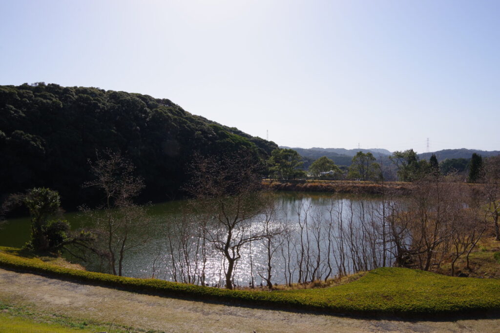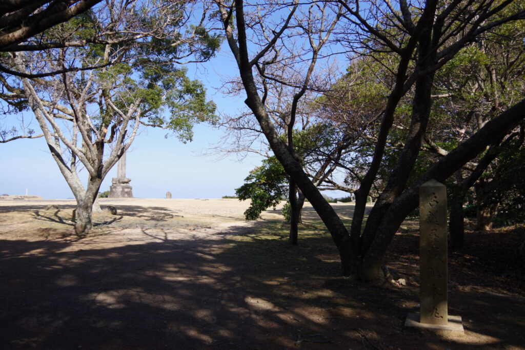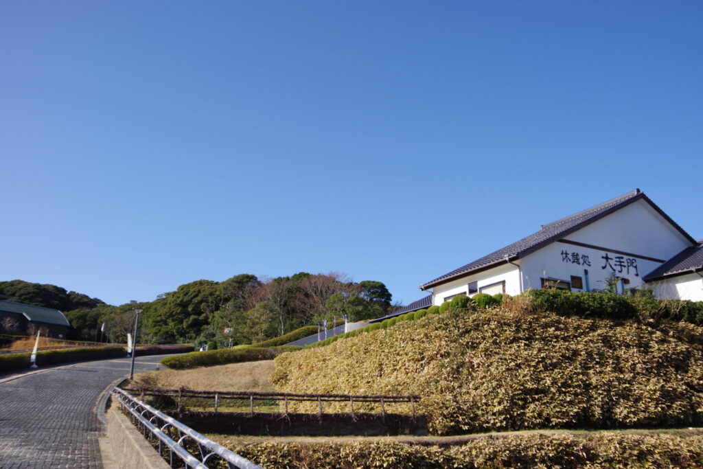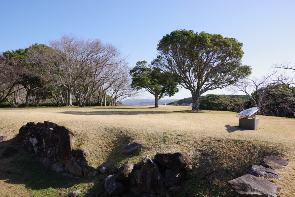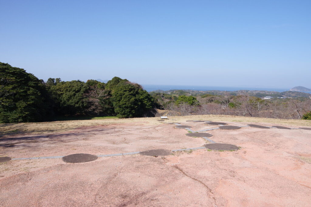 前方の斜面は搦手口と呼ばれる、名護屋城に5つある虎口(城の出入口)のひとつです。搦手とは城の裏側という意味で、表側の大手に対する言葉です。城の守りを固めるために通路を屈折させた、典型的な喰違い虎口の形状をしており、櫓台下側では瓦敷排水溝跡が見つかりました。