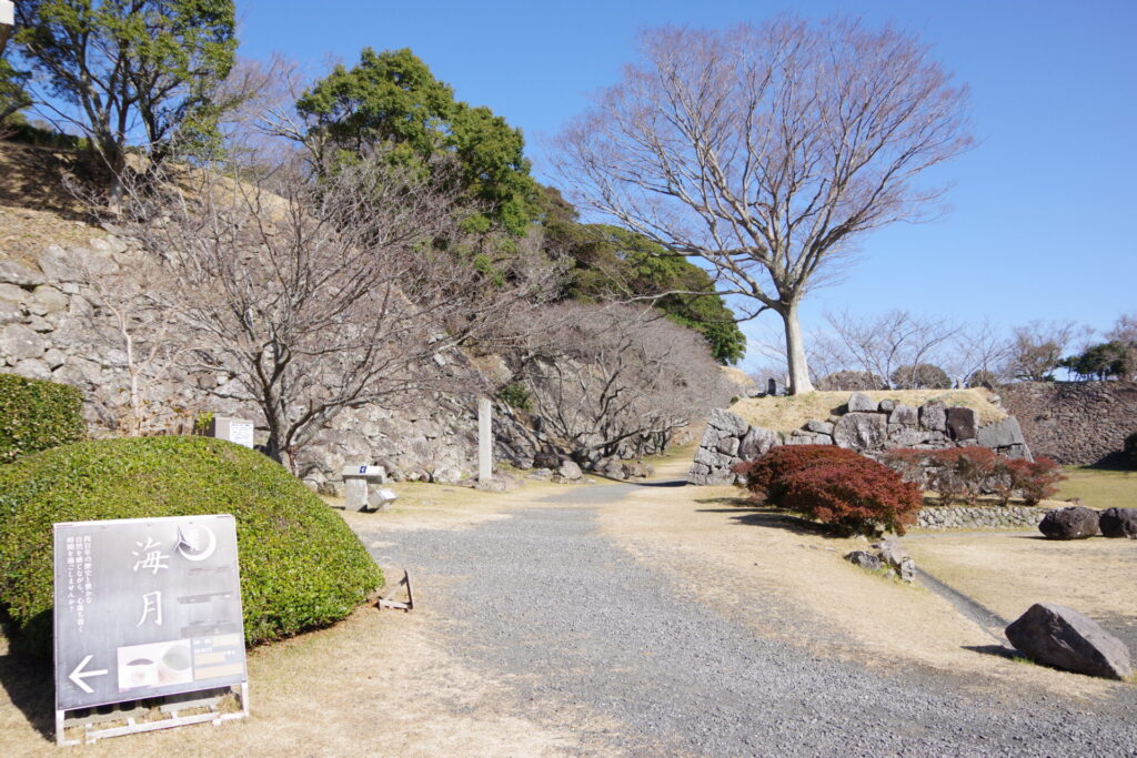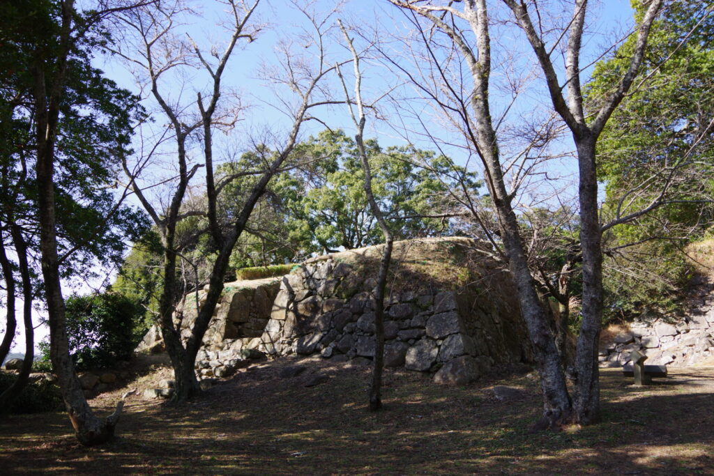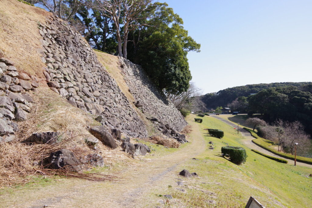 遊撃丸や天守台の石垣は、自然石を半分に割り、割った面を表面に見せる”打ち込みはぎ”の石積が顕著です。石垣崩壊防止のため、危険個所では解体修理や新しい石の補充や植栽を行い、当時の石垣の様子が推定されるような整備をしています。