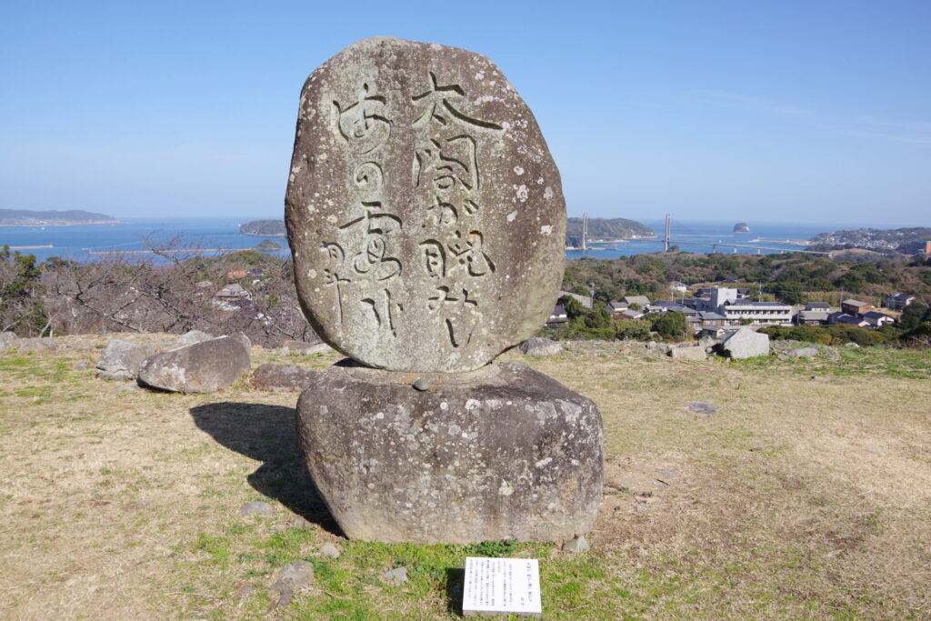この石は、文禄・慶長の役に際して名護屋城周辺に滞在した諸大名の陣屋に、軍旗や馬印などを立てるために、玄武岩質の自然石でつくられた「旗竿石」と呼ばれるものです。昭和15年頃、名護屋村から唐津市坊主町の民家に移設され、再び、鎮西町名護屋の地にもどされたものです。中央に直径26.5㎝・深さ12㎝の円形の穴が穿ってあります。