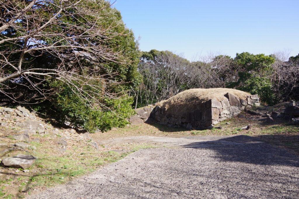 現在は、ここ弾正丸東側とともに、平成3年度と4年度(1991~1992)に、石垣の緊急修理を実施し、あわせて仮園路を設置しました。