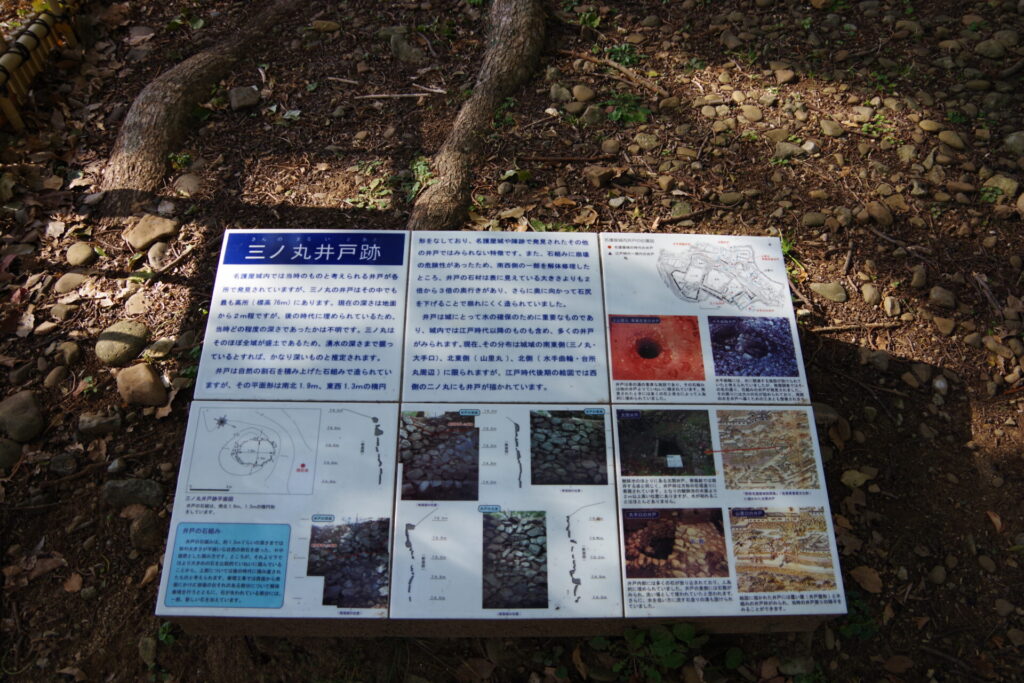 井戸は城にとって水の確保のために重要なものであり、城内では江戸時代以降のものも含め、多くの井戸がみられます。現在、その分布は城域の南東側(三ノ丸・大手口)、北東側(山里丸)、北側(水手曲輪・台所丸周辺)に限られますが、江戸時代後期の絵図では西側の二ノ丸にも井戸が描かれています。