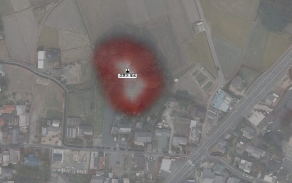猫城は、室町時代に麻生氏の端城として築かれたといわれ、その城跡には、現在、月瀬八幡宮の社殿があります。城跡の丘陵は、高さ約20メートルの円錐状で、すそ野には水濠の名残りがみられます。山鹿城の麻生元重と宗像大宮司氏貞は、数度の合戦に及ぶも決着がつかず、天正6年(1578)、遠賀川の東は麻生領、西は宗像領となります。氏貞は、家臣吉田論行に雑兵150余人をつけ、猫城に配属します。