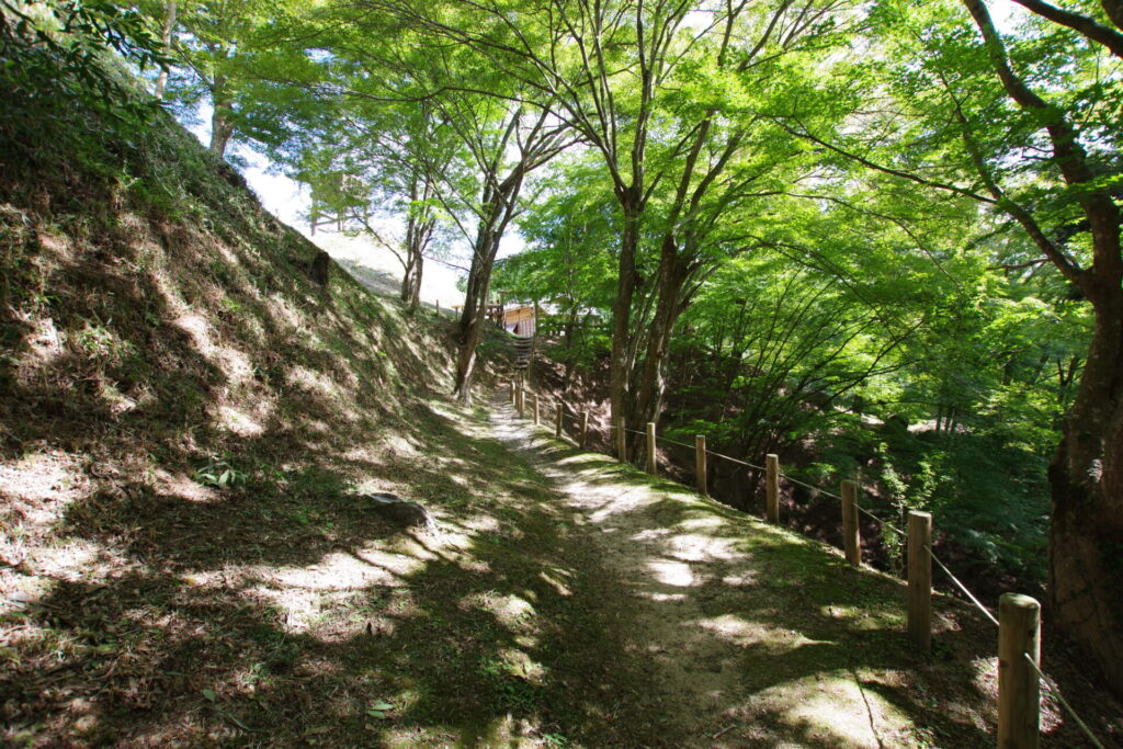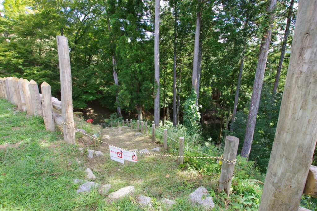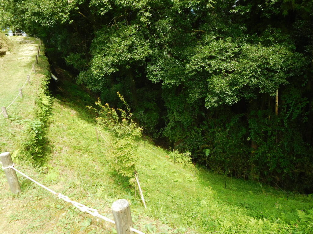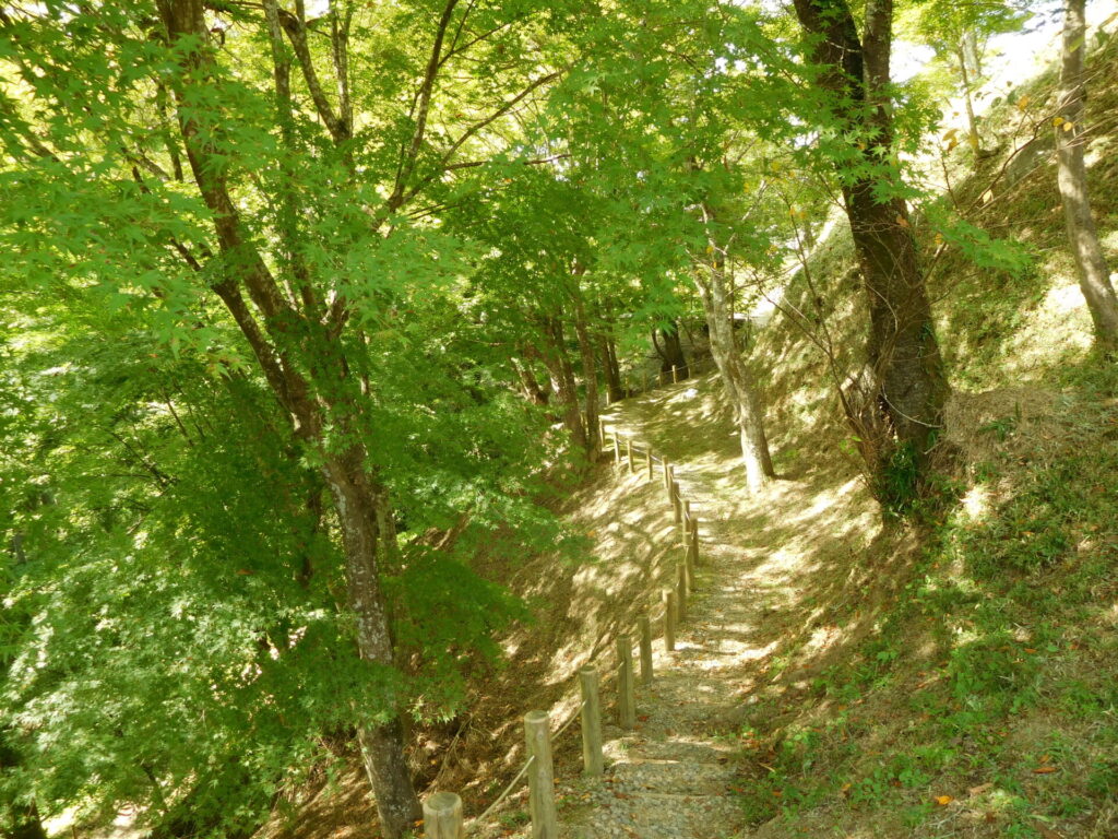 足助城の中心施設と、南の山上に伸びる施設を区切る役割をもった堀です。堀の底を通路としても使っていました。