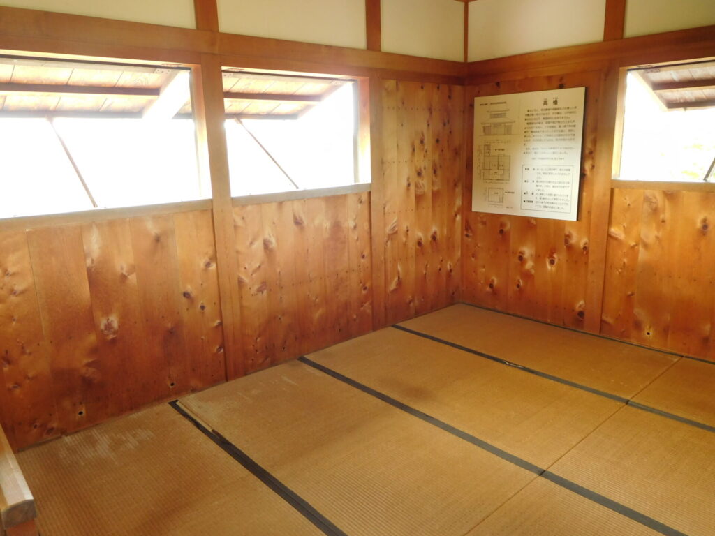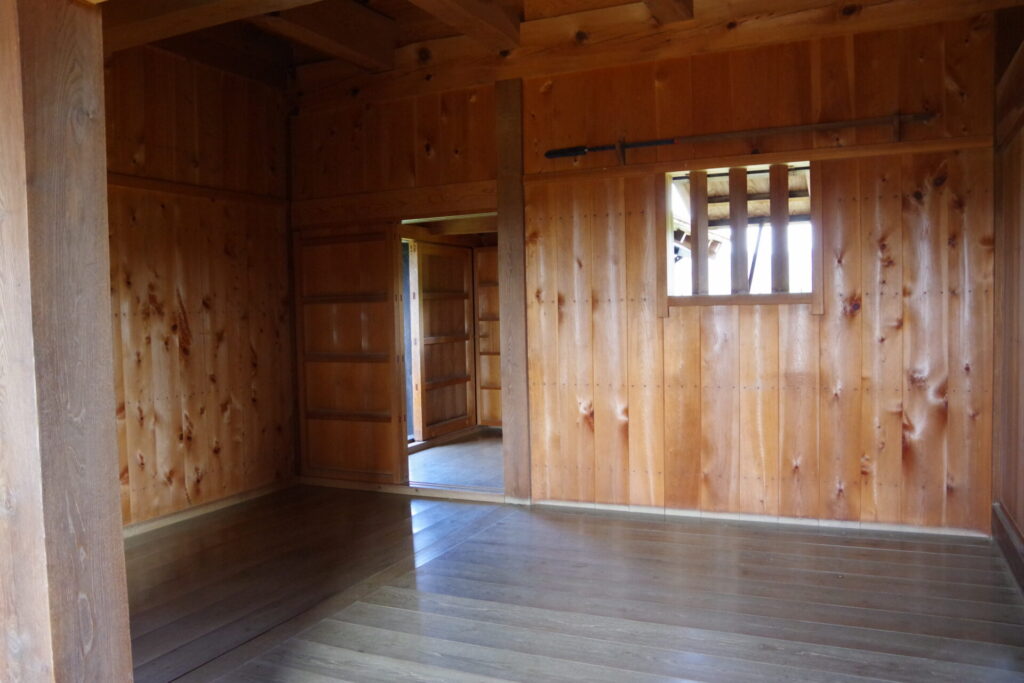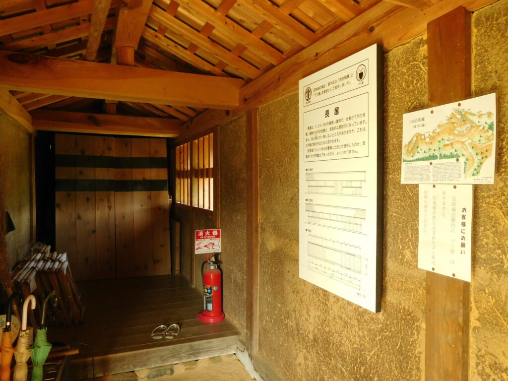 長屋は、11.5×1.8mの細長い建物で、北側が7尺の柱間、南側が6尺の柱間と、変則的な間取りになっています。また、柱と梁とが一致しないところがありますが、これは、3尺幅の窓を作るためと思われます。武者溜りとして本丸を警備した武士が居住したのか、武器をいれる物置きであったのか、よくわかりません。