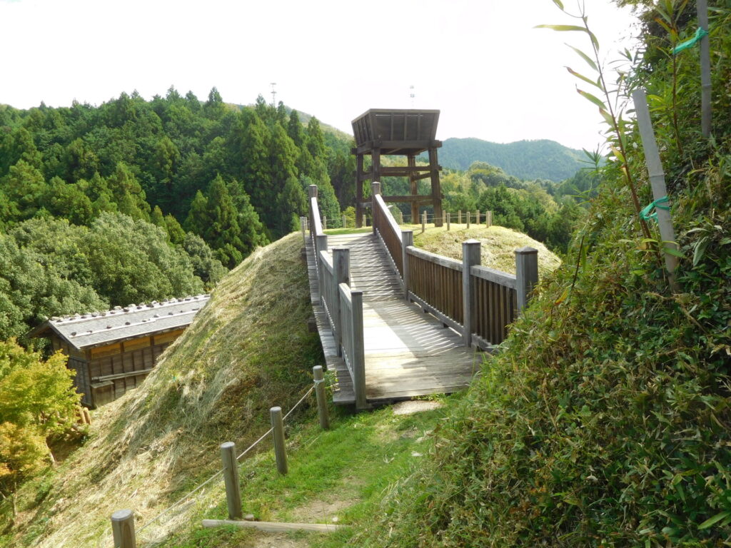 柱穴から、2時期以上の建物がわかりましたが、今回再建したものは、後の時期のものです。なお、高櫓は、NHKの鉄塔の下まで伸びていますので、南に1mずらして復元しました。