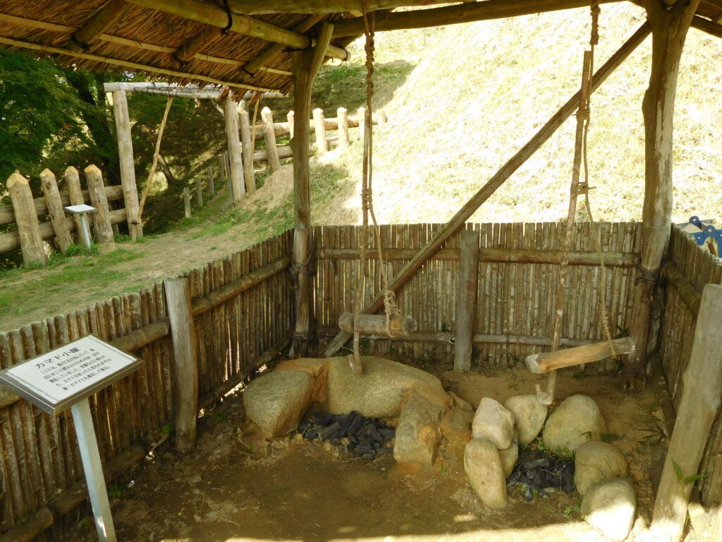 ここには、焼けた石が並んでいて、周辺に木じり(燃えかけの木)や炭・灰が散乱していました。炊事などに使われた、カマドがあったと思われます(小屋・カマドとも推定して復元)。