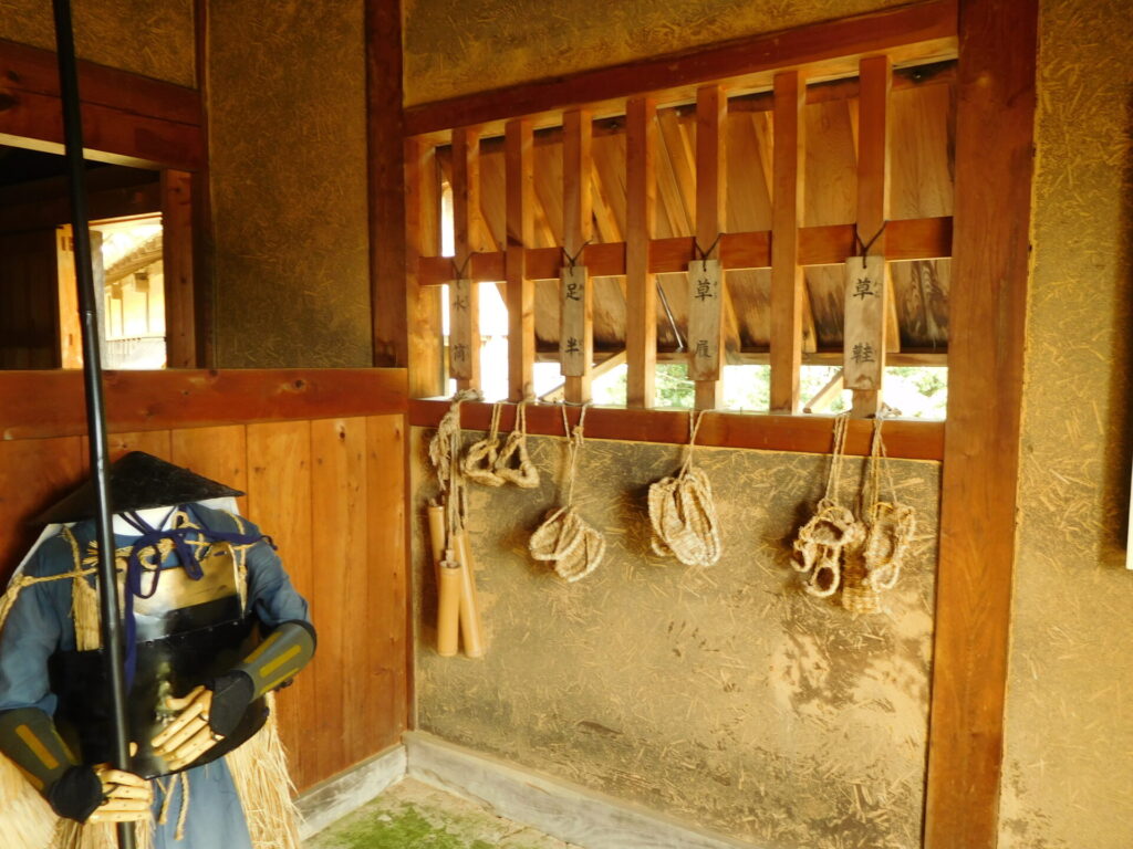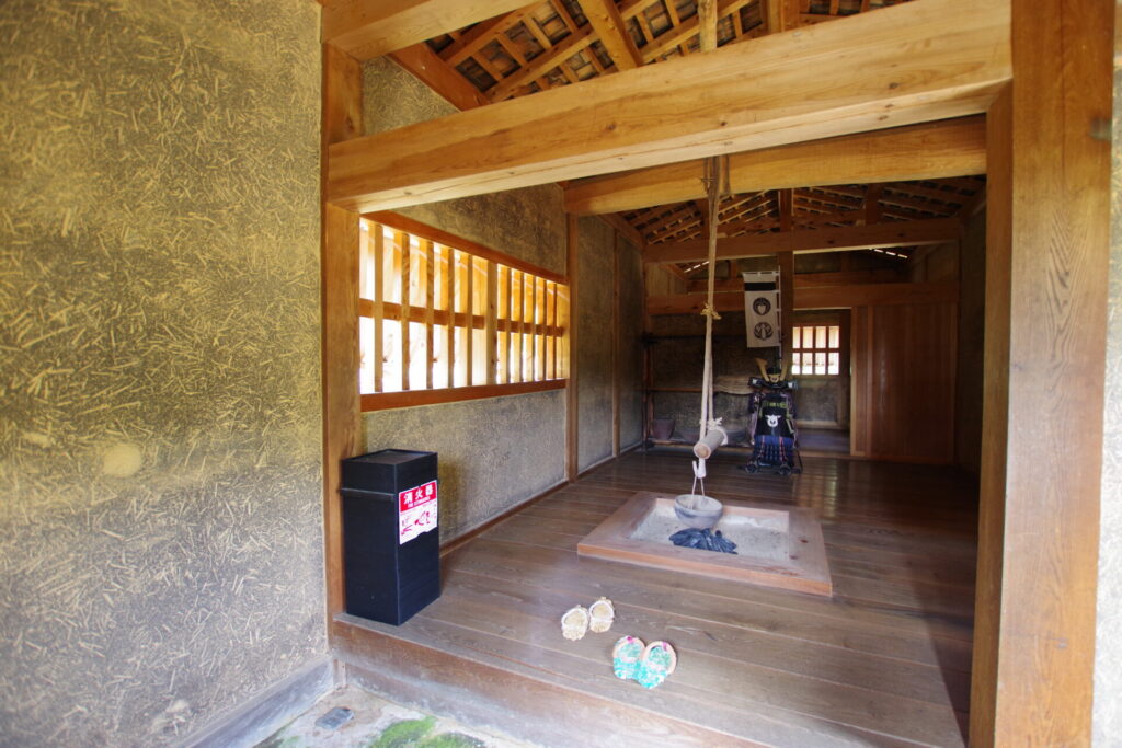 厨や長屋の土壁には、戦が長期になっても食べ物に困らないように、イモの茎が使われていました。また、土間には塩が練り込まれていました。今の足助城でもイモの茎、塩を実際に使って復元しました。