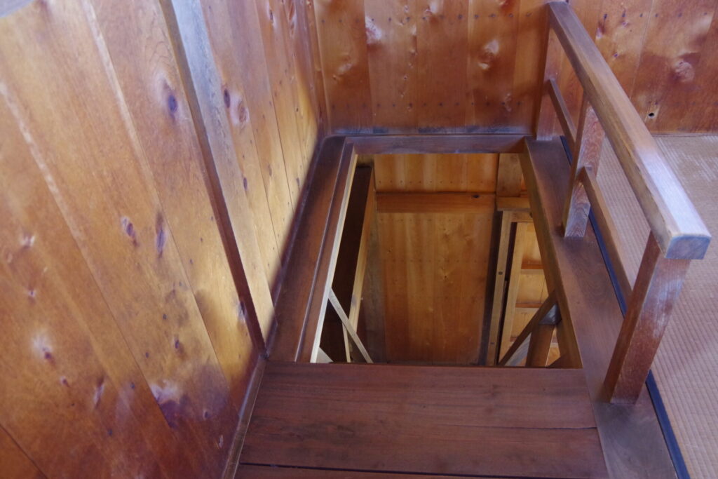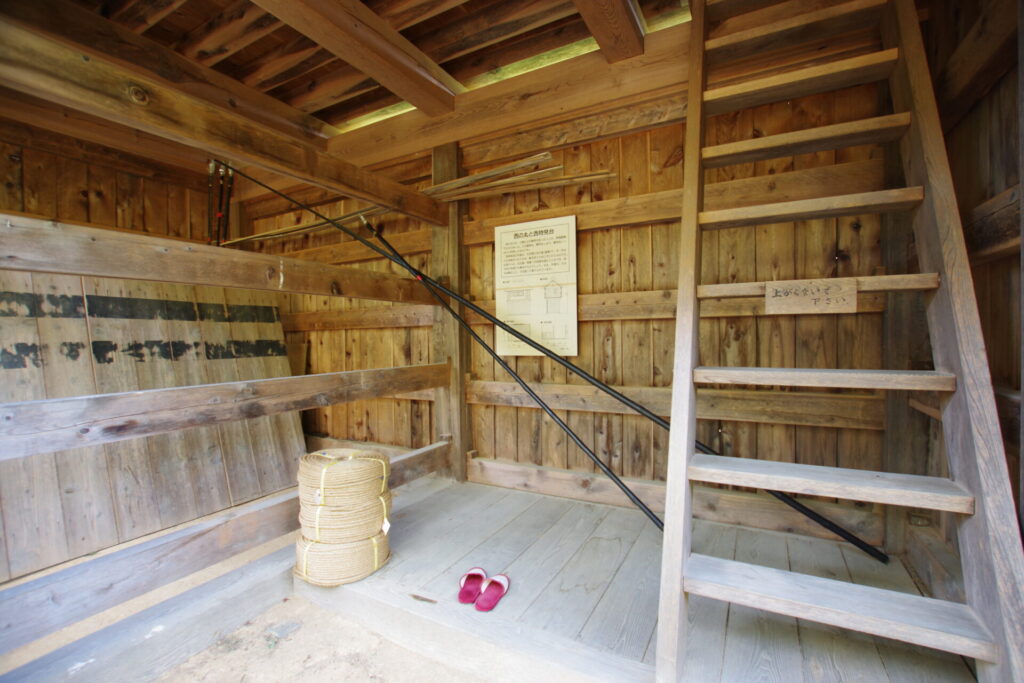 この物見台は、大きな岩盤の上にあります。2.7×5.4mの矢倉は、掘っ建て柱の建物です。2層にしたのは、間近まで他の建物が建てられていたためでしょう。