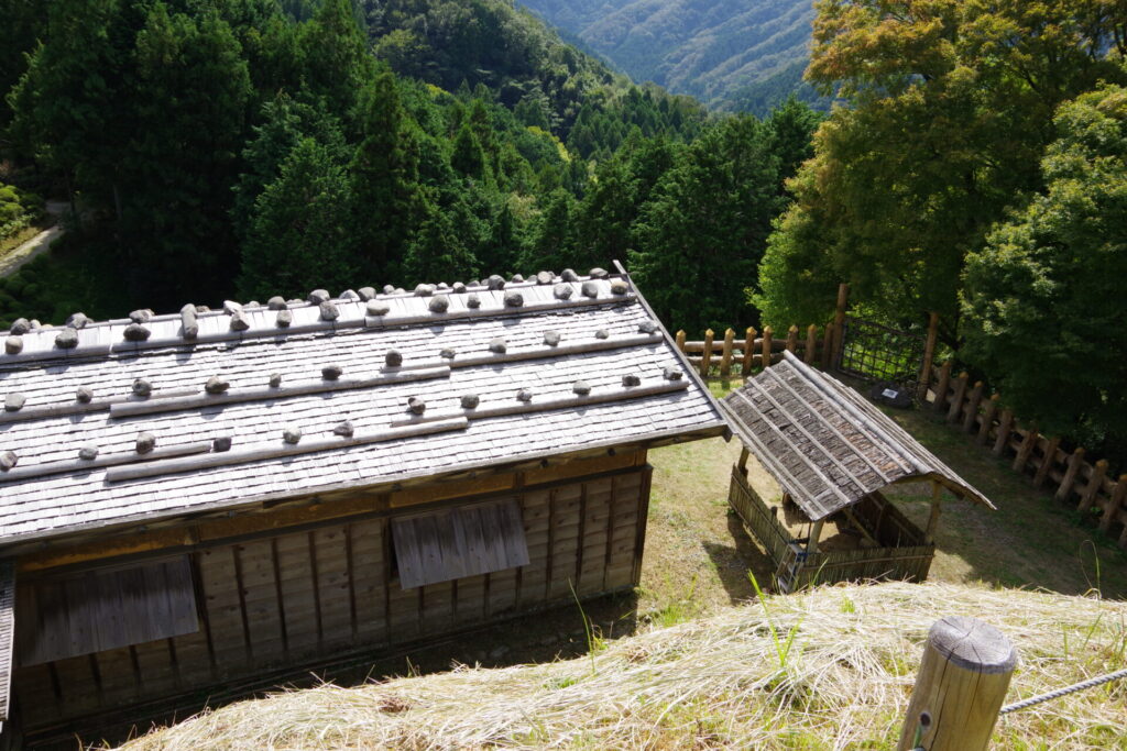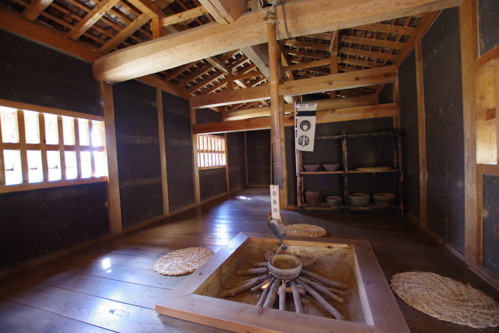 「厨」は、食事の準備を行なうところという意味ですが、食事の準備だけではなく、武士が寝泊りをして、武具の手入れやワラジ作りなど、いろいろな仕事をしたのでしょう。発掘調査で、柱穴列に沿って石が数多く出土したため、石置き屋根にしました。この厨の大きさは、11.8×6.4m、隣の厨は、10.3×3.6mです。