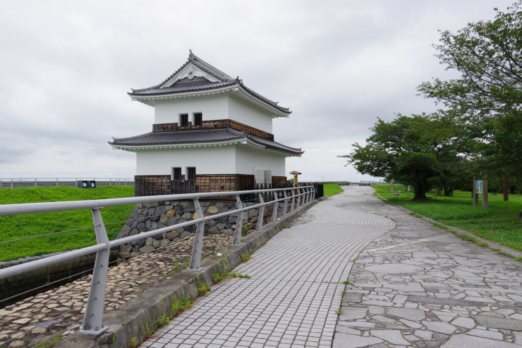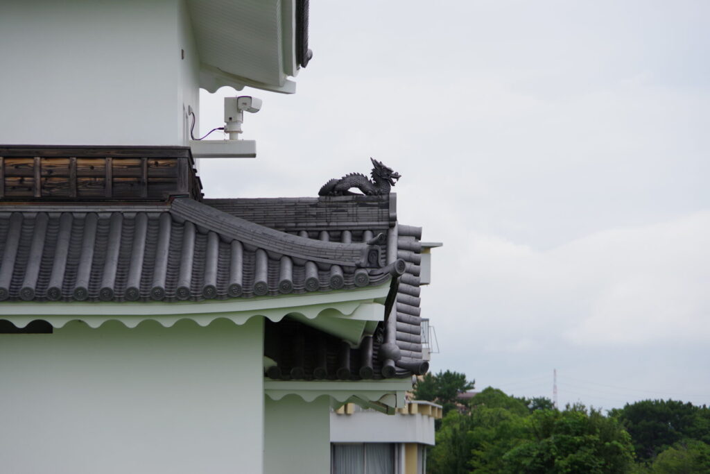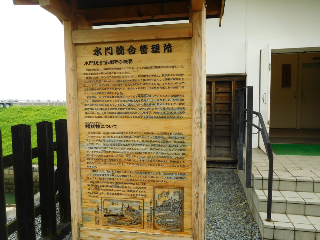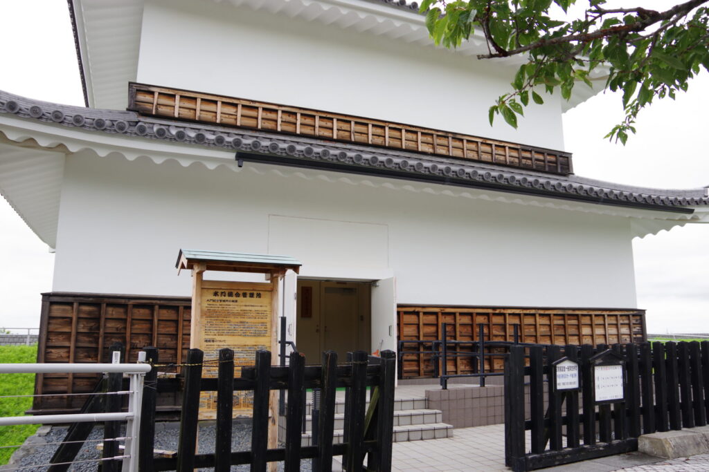 これら三つの水門は高潮警戒時に操作する防潮水門で、安全性・効率性・迅速性を考慮し集中操作できるよう統合管理所を設置しました。管理所は、かつて桑名城の隅櫓の一つである蟠龍櫓が建っていたところに位置するため、建物の設計にあたってこの櫓の外観復元を目指すこととなりました。伊勢湾台風で当初の石垣が失われているなど、復元のための歴史資料は限られましたが、絵図等に描かれた櫓の姿や同時代の類例を参考に、往時の姿になるべく近づけるよう推定復元しました。