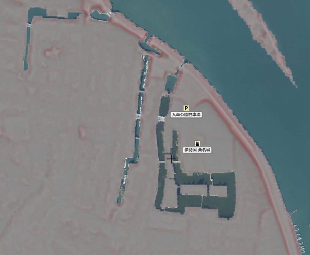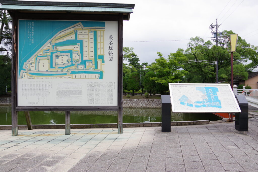 伊勢国桑名(現在の三重県桑名市)に位置した平城(水城)。かつては東海道五十三次の要衝であり、伊勢湾に面した立地を活かした水城としても知られる。戦国時代末期に織田信雄が改修し、江戸時代に入って徳川四天王の一人である本多忠勝が大規模に整備した。その後、松平氏(久松松平家)の居城として幕末まで続いた。現在、城址は九華公園として整備され、堀の一部や石垣、曲輪の遺構が残る。