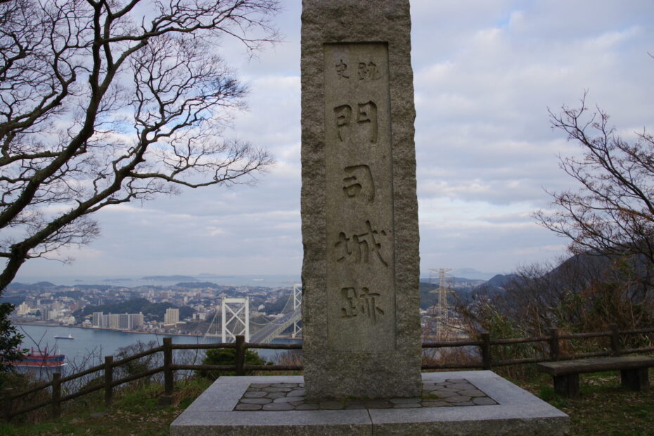 門司城(もじじょう)は、福岡県北九州市門司区大字門司の古城山(こじょうさん)山頂に築かれた中世山城である。標高約175メートルの山上から関門海峡を一望できる位置にあり、鎮西の玄関口を押さえる軍事拠点として、鎌倉期から戦国期にかけて大内氏・大友氏・毛利氏らの争奪戦の舞台となった。現在、城跡は和布刈公園(めかりこうえん)の一部として整備され、山頂には門司城跡の石碑とわずかに残る石垣、そして明治期要塞の砲台跡が往時の面影を伝えている。関門橋と海峡を見下ろす眺望は圧巻で、城跡そのものが「海峡の歴史を俯瞰する展望台」となっている。