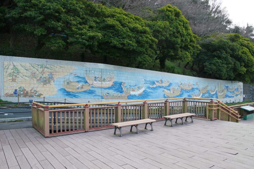 壇之浦合戦の模様を美しい有田焼の陶板で再現した壁画で、義経、教経、二位の尼、安徳帝、建礼門院などが生きいきと描かれています。