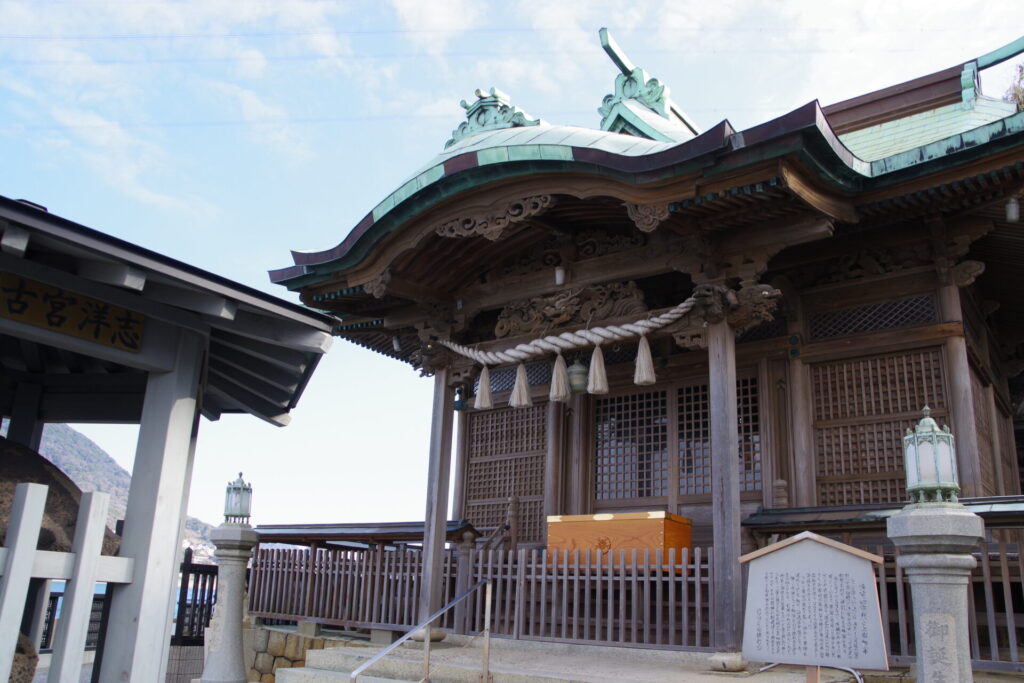 毎年旧暦元日の早朝、3人の神職が烏帽子、狩衣、白足袋に草履姿で干潮の冷たい海に入ってワカメを刈る神事。刈り取ったワカメを神前に供え、航海の安全や豊漁を祈願することで知られている神社です 。また、神社前に細川忠興が寄進した灯籠があります。