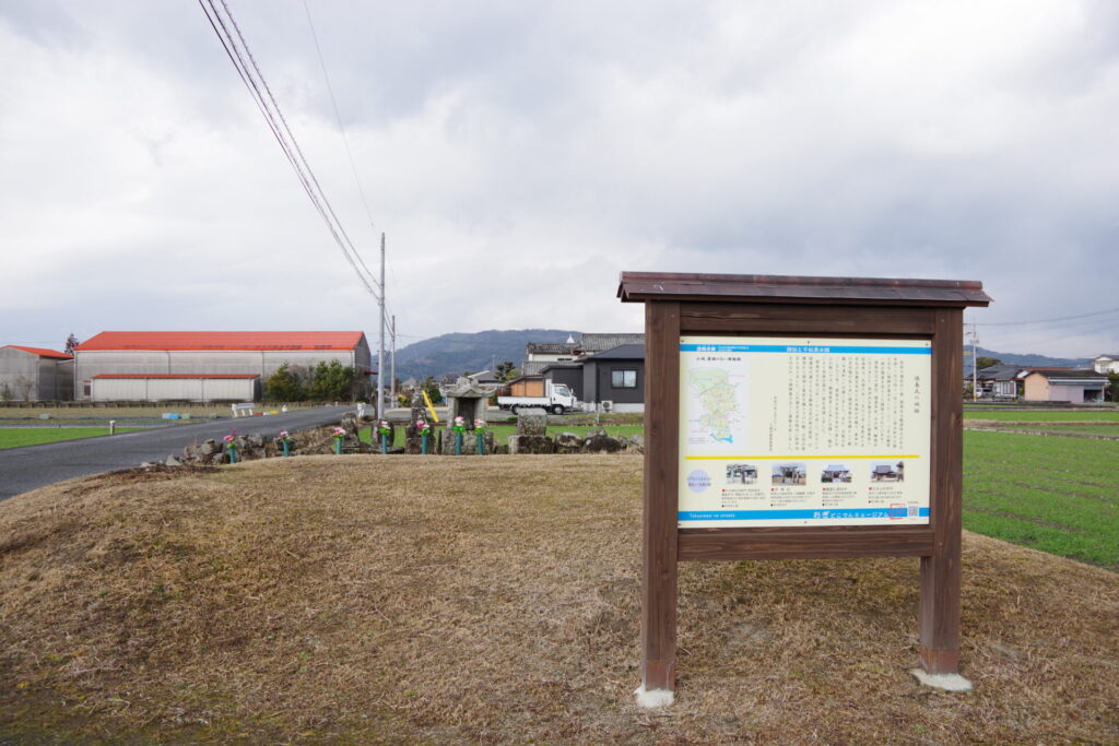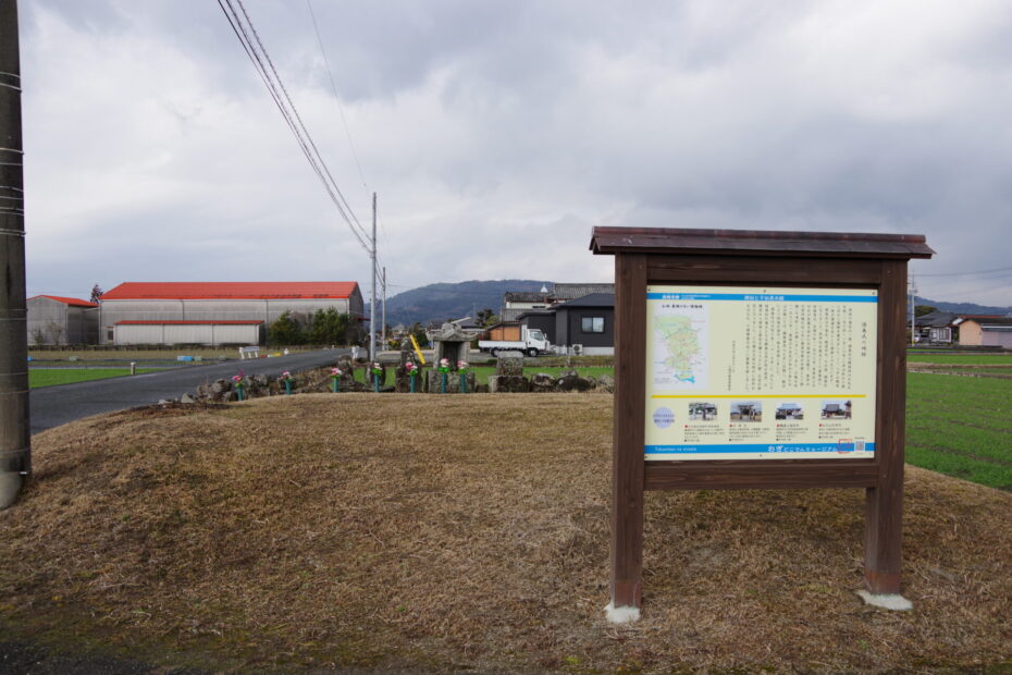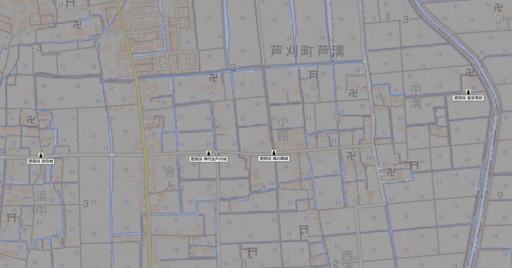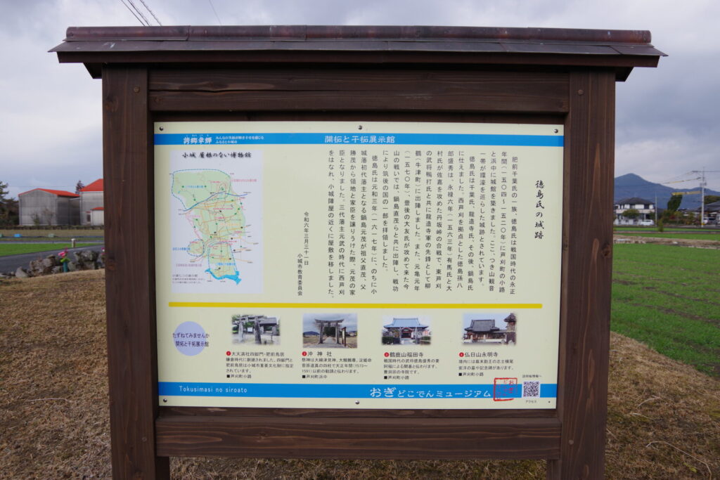 徳島城は、佐賀県小城市芦刈町浜枝川に所在した中世の平城で、小城千葉氏の一族である徳島氏(とくしまし)の居館・城郭と伝えられる。周辺には「浜中城(はまじょう)」や「徳島館(とくしまやかた)」などの名称も残り、陣の森城(じんのもりじょう)とともに徳島氏の城館群を構成していたと考えられている。現在は圃場整備や宅地化が進み、城郭としての姿はほとんど失われているが、「つき山観音(つきやまかんのん)」と呼ばれる土壇や、水路として残る「徳島堀(とくしまぼり)」が、かつての城と堀の記憶をかすかに伝えている。